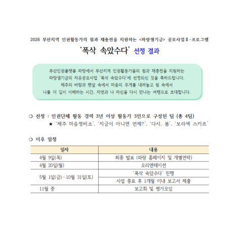 부산인권플랫폼 파랑에서 부산지역 인권활동가들의 쉼과 재충전을 지원하는 파랑샘기금의 공모사업 ‘폭삭 속았수다’를 엽니다.