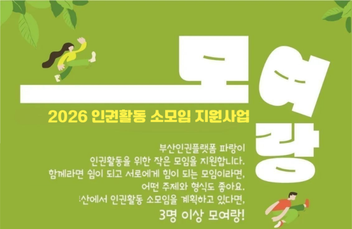 18일 전- 부산인권플랫폼 파랑 🌿 부산에서 인권활동 소모임을 계획하고 있다면, 2026 인권활동 소모임지원사업 <모여랑> 신청하기 👉 parang.or.kr/2026모여랑
