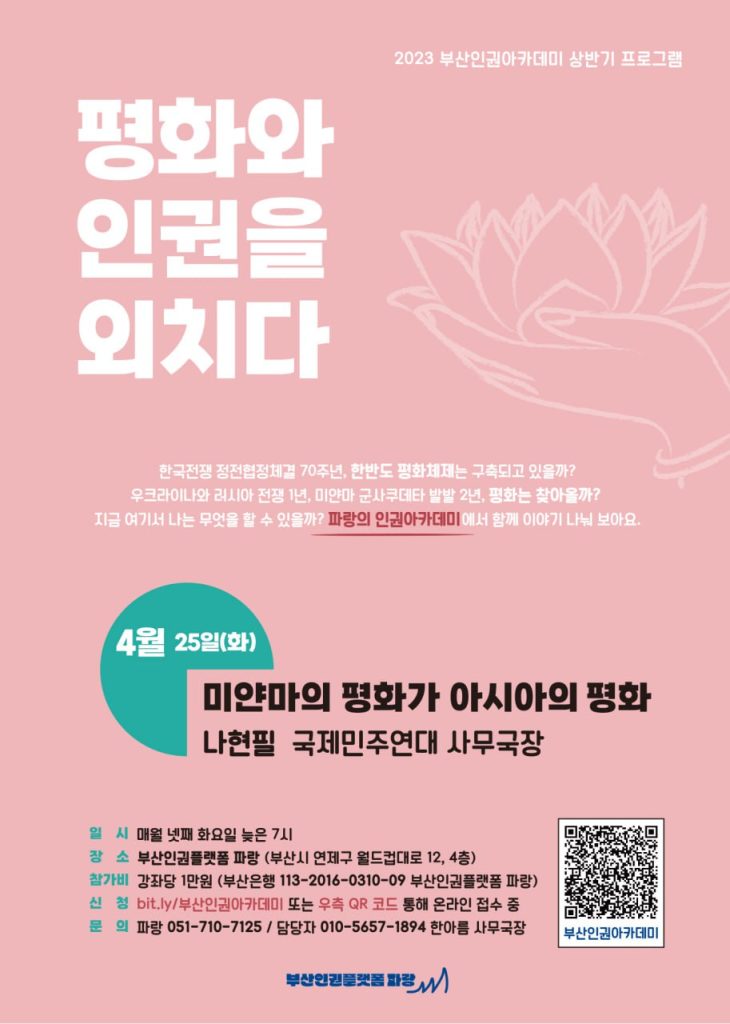 2023 상반기 부산인권아카데미 <평화와 인권을 외치다>의 2번째 시간은 국제민주연대 나현필 사무국장님과 함께 ‘미얀마의 평화가 아시아의 평화’라는 주제로 만납니다.