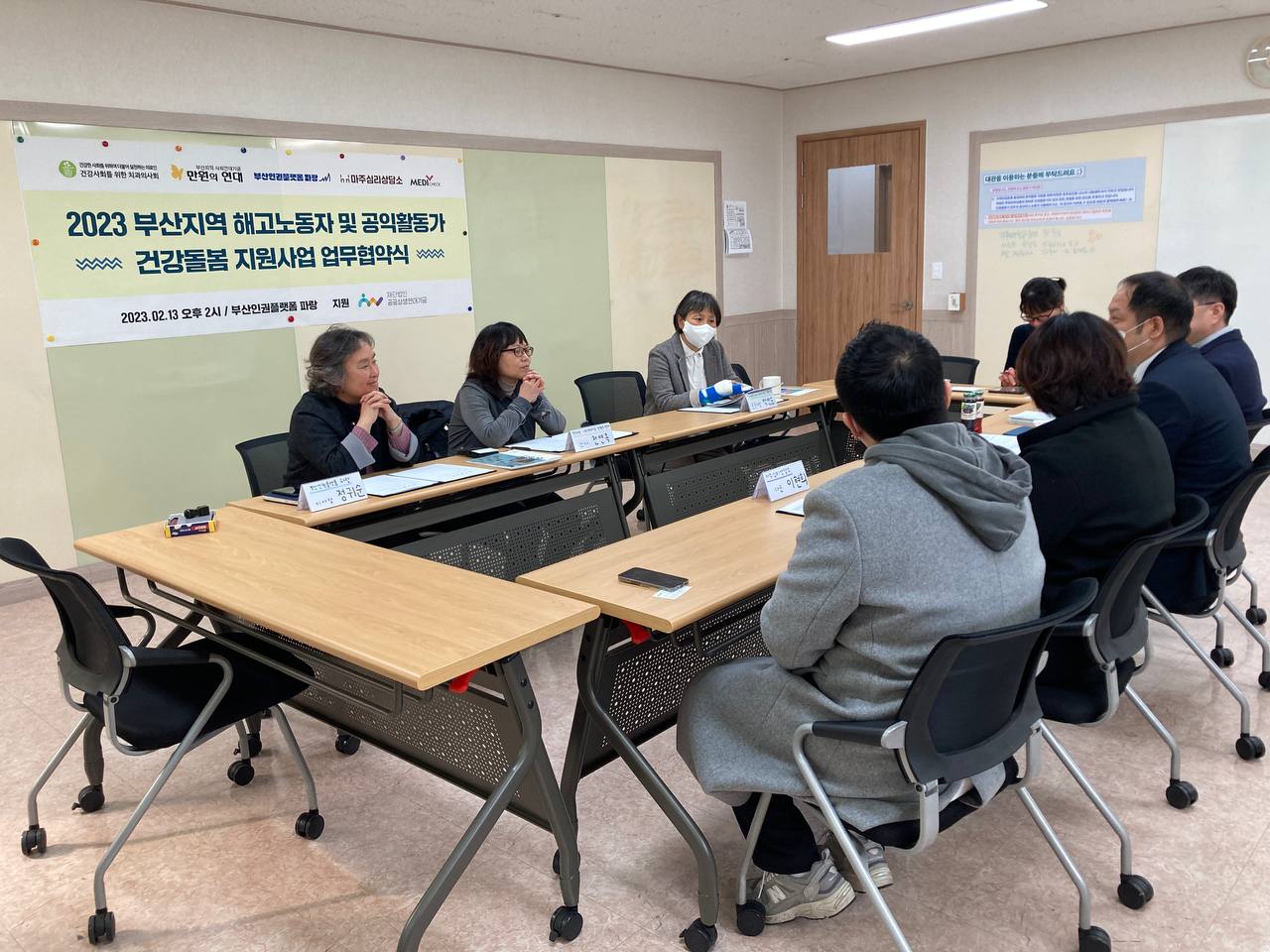 2월 13일 파랑에서 <2023 해고노동자 및 공익활동가 건강돌봄 지원사업>을 위한 협약식이 있었습니다. 🩺신체 검진은 지난 여름, 감만동에 신설된 💕한국건강관리협회 부산서부지부와 함께, 🩹마음 검진은 해운대에 있는 🪑마주심리상담소와 함께하기로 했고요. 🦷치과 검진과 진료는 🧰건강사회를 위한 치과의사회 부산경남지부와 함께 한답니다! (부산지역 연계 치과들이 협력하여 검진과 진료를 나누어 맡아주실 예정이에요!🙌)