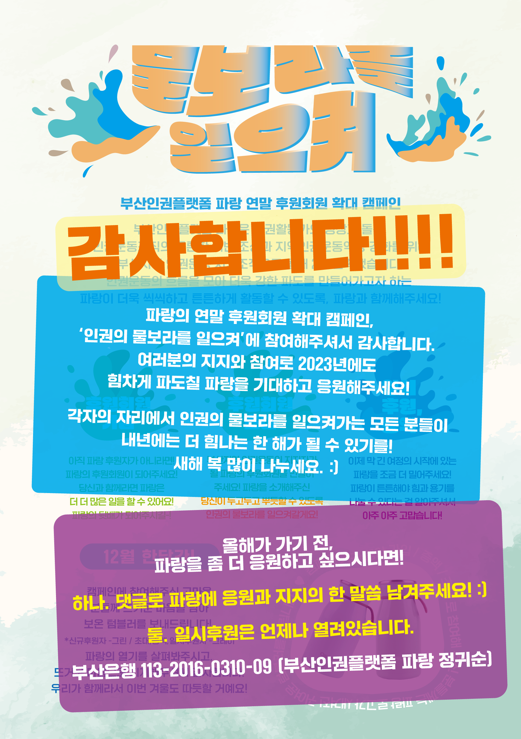 많은 분들께서 파랑의 연말 후원회원 확대 캠페인에 참여해주셨어요! 🙂 2022년 2월에 출범한 파랑이 어찌 그리 많은 일을 해내려 하느냐는 우려도 많았는데요. 정말 괜찮냐는 애정섞인 우려에 감사한 마음도 들고, 지역 동료 활동가들에게 걱정끼치지 않아야겠다는 조바심도 함께 들었어요. 😳 파랑의 첫 후원회원 모집 캠페인에 많은 분들이 호응하고 참여해주셔서 파랑 사무국은 따듯한 기운 가득히 새해를 맞았습니다. 감사해요! 각자의 자리에서 인권의 물결을 일으키는 이들이 서로의 힘이 되어 지지하고 지탱할 수 있기를 바라며- 우리, 새 해 복 많이 지어요! 새해에는 ‘파랑이 있어 참 든든하고 좋다’는 이야기를 어려운 인권현장에서 더 많이 들을 수 있는 한 해가 되기를 바라봅니다. 더불어 함께해주시기를 바라요. ☺