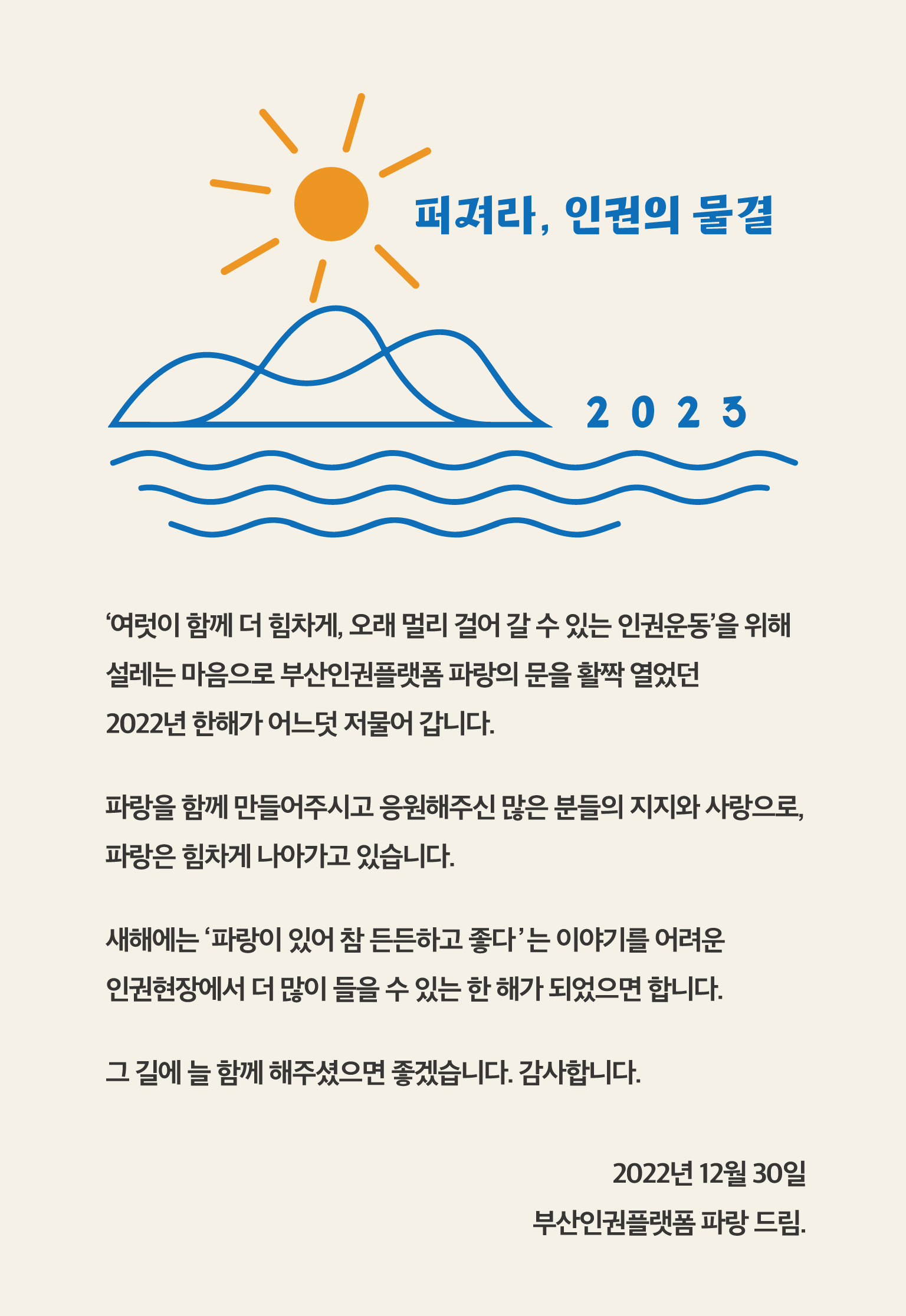 새해는 매번 돌아오지만, 매번 어찌 이리 낯설고 어색한지요. 아직도 년도를 쓰는 자리에 ’23’ 대신 ’22’를 적어넣다 고쳐쓰곤 합니다. 시간과 숫자가 시절을 나누어도, 기쁨과 슬픔은 계속 이어지는 것 같아요. 설날을 보내고 꽃샘추위를 지나 찾아올 봄날을 기다리며, 껴입은 옷도, 찬기 서린 마음도, 우리의 연대도 함께 두터웁게 만들어보아요- 모든 이가 새해 인권 더 많이 누리도록! 그럼 파랑의 새해 소식 전할게요. 🙂 |