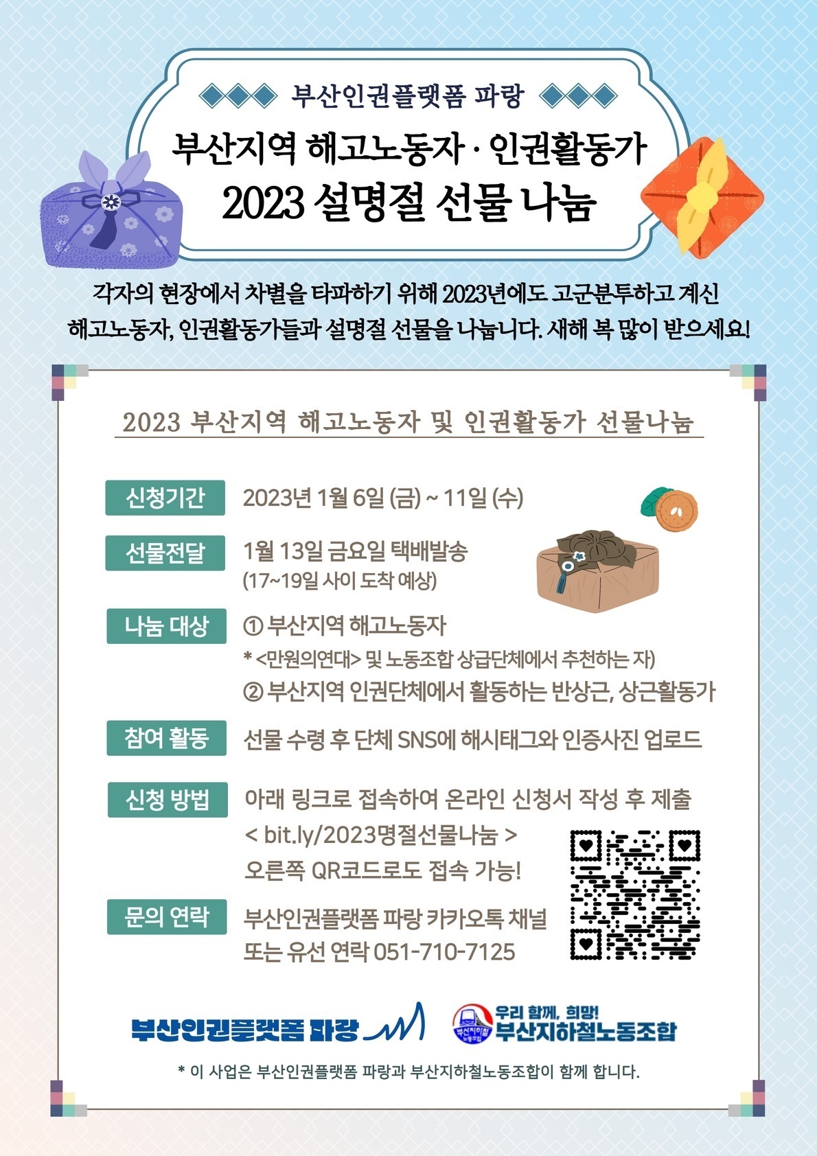 1️⃣ 하나, 부산지역 해고노동자와 인권활동가를 위한 2023 설명절 선물 나눔 사업!