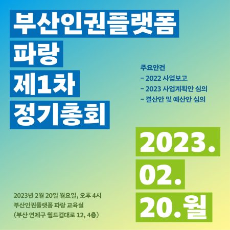 올해 인권현장의 여러 어려움이 예상됩니다. 파랑은 인권활동가와 단체들이 지치지 않고 다치지 않고 함께 나아갈 수 있도록 격려하고 지원하는 든든한 울타리가 되고 싶습니다. 2023년에는 더 많은 분들과 함께, 부산지역 인권운동의 크고 작은 물결을 일으켜나갈 수 있기를 기대합니다.