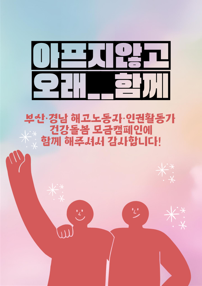 2025๋ 12์ 7์ผ๋ถํฐ 12์ 27์ผ๊น์ง <๋ถ์ฐ๊ฒฝ๋จ ํด๊ณ ๋ ธ๋์ยท์ธ๊ถํ๋๊ฐ ๊ฑด๊ฐ๋๋ด ๋ชจ๊ธ์บ ํ์ธ: ์ํ์ง ์๊ณ , ์ค๋ ํจ๊ป>์ ์ฐธ์ฌํด์ฃผ์ ๋ถ๋ค๊ป ๊ฐ์ฌ์ ์ธ์ฌ๋ฅผ ๋๋ฆฝ๋๋ค. ์ด 17๊ฐ ๋จ์ฒด์ 2๊ฐ์ ๊ธฐ์ , ๊ฐ์ธ 194๋ช ์ด ํจ๊ปํด์ฃผ์ ๋๋ถ์, ๋ชจ๊ธ๋ชฉํ์ก์ 204%์ ๋ฌํ๋ 3,056๋ง์์ ๊ธฐ๊ธ์ด ์กฐ์ฑ๋์์ต๋๋ค. ๋ง์์ ๋ชจ์์ฃผ์ ๋ชจ๋ ๋ถ๋ค์๊ฒ ๊น์ ๊ฐ์ฌ๋ฅผ ์ ํฉ๋๋ค.