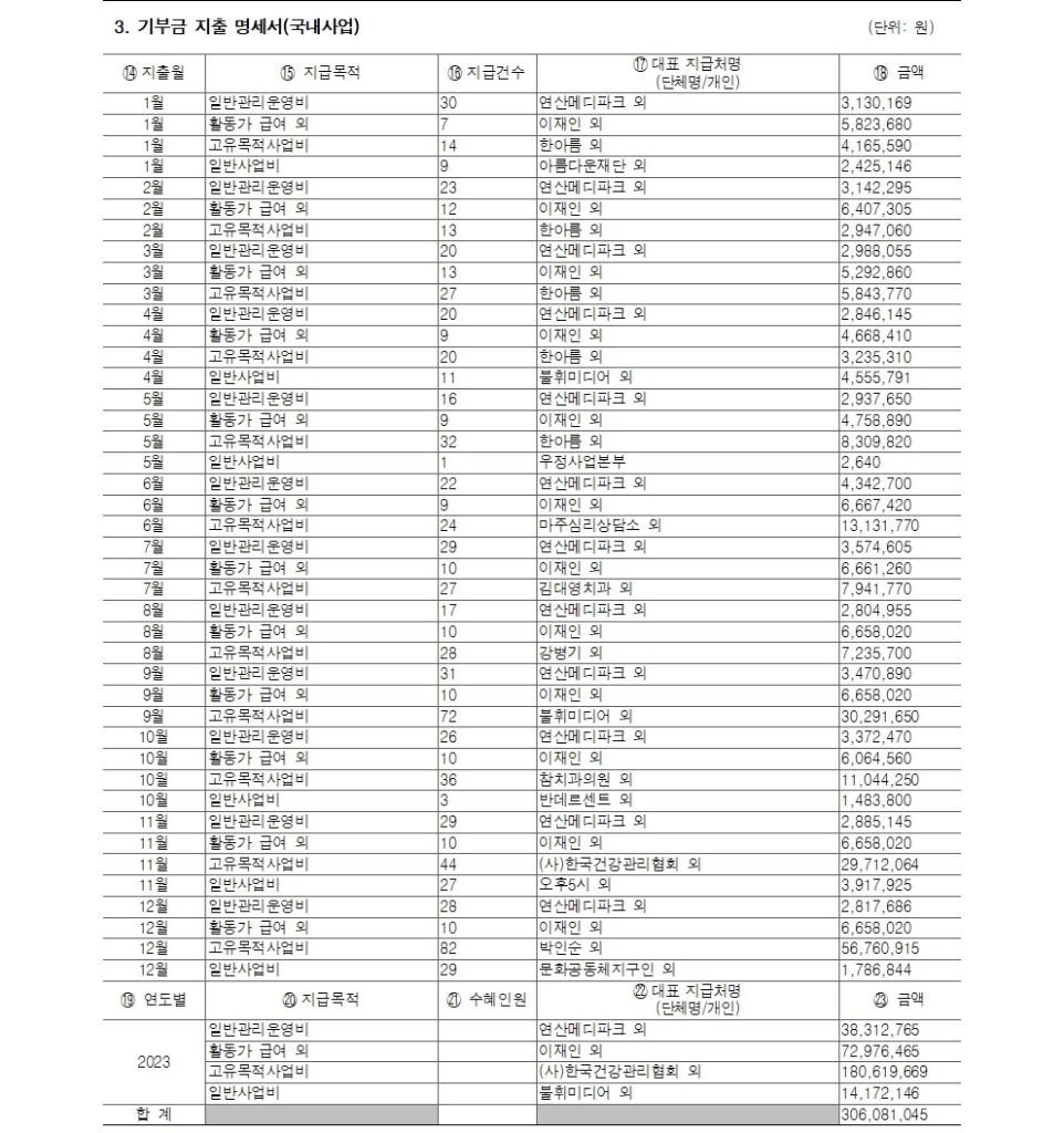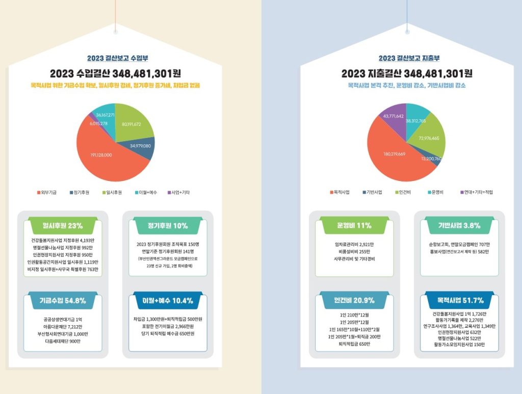 2023 연간 기부금 모금액 및 활용실적 명세 공시 공지 2023년도 사단법인 부산인권플랫폼 파랑의 기부금 모금액 및 활용실적 명세를 아래와 같이 공시합니다. 2023년 한 해 동안 사단법인 부산인권플랫폼 파랑을 응원해주신 기부자들께 깊이 감사드립니다. ♥162024년 04월 30일2025년 05월 15일공지지금 파랑은