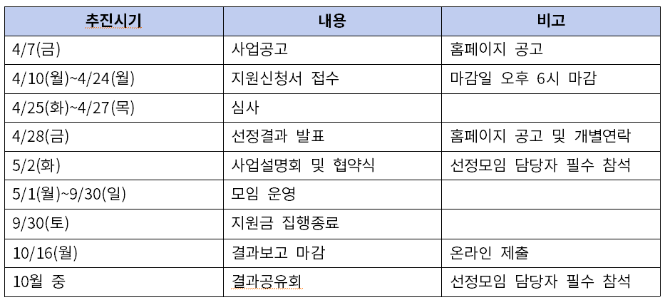 ※ 정치, 종교, 수익창출 등 본 사업의 취지에 부합하지 않는 모임은 지원에 제한이 있을 수 있습니다.
