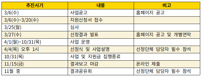 ※ 정치단체, 종교단체, 친목단체, 영리단체 등 본 사업의 취지에 부합하지 않는 단체의 사업은 지원에 제한이 있을 수 있습니다.