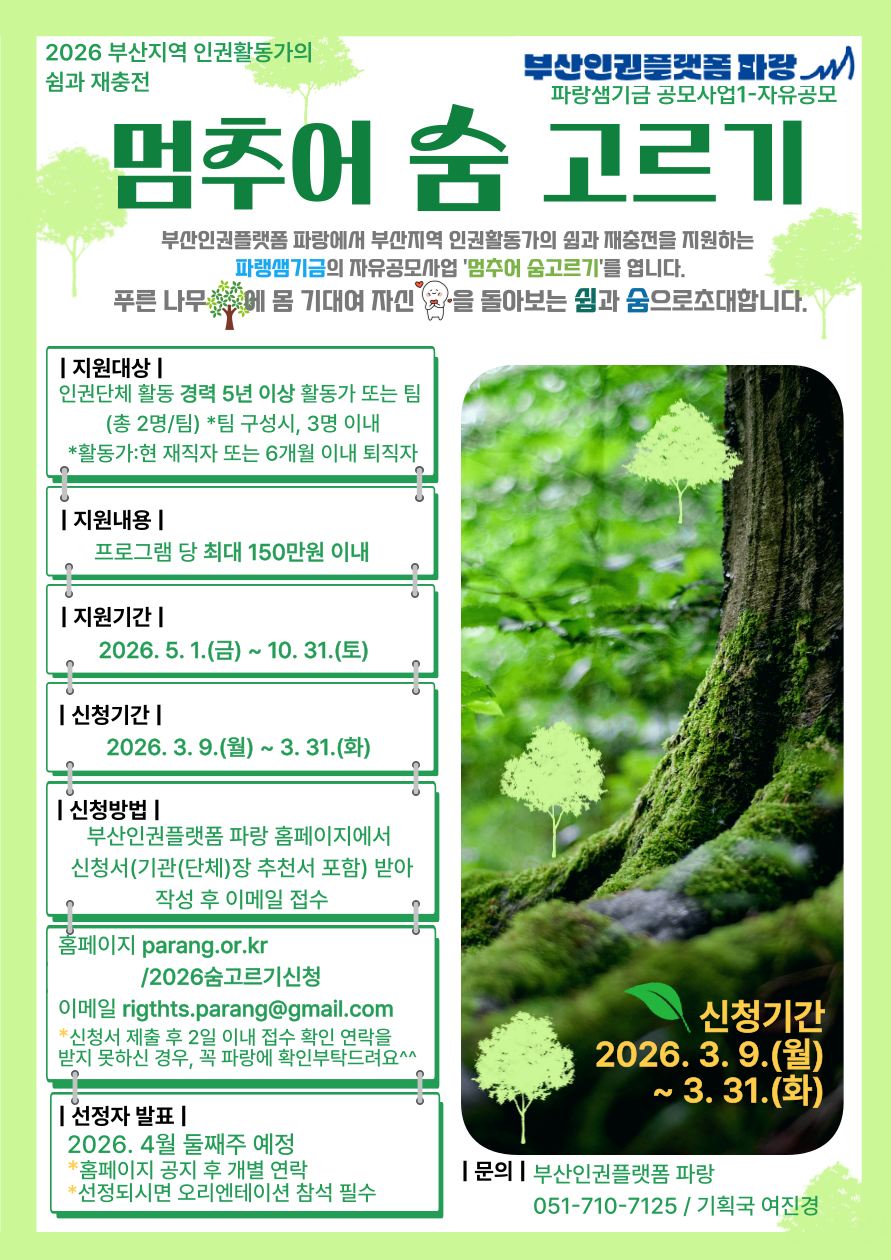 2026 부산지역 인권활동가 쉼과 재충전 공모사업 ‘멈추어 숨 고르기’