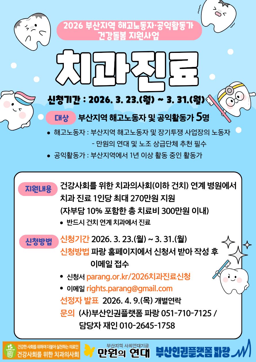 고군분투하는 해고노동자 동지들과 공익활동가 동료들이 남몰래 앓고 있는 치과진료의 문턱을 낮추고자 합니다.