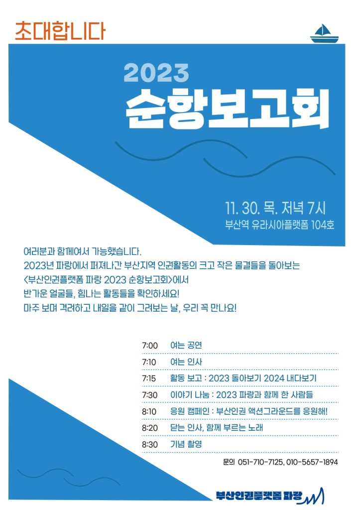 [파랑 2023 순항보고회]에 초대합니다! 지금 파랑은 여러분과 함께여서 가능했습니다. 2023년 파랑에서 퍼져나간 부산지역 인권활동의 크고 작은 물결을 돌아보는 <부산인권플랫폼 파랑 2023 순항보고회>에서 반가운 얼굴들, 힘나는 활동들을 확인하세요! 마주 보며 격려하고 내일을 같이 그려보는 날, 우리 꼭 만나요! 일시: 11월 30일(목) 저녁 7시 장소: 부산역 유라시아플랫폼 104호 #여럿이함께_더힘차게_오래멀리가는_인권운동을위한 #부산인권플랫폼파랑 #2023순항보고회 #파랑의든든한벗_후원회원님들과 #파랑에곁을내어주신_활동가분들과 #올해를돌아보고_내년을내다보는 #다정하고따뜻한_갈무리모임 #우리꼭만나요! 2022 파랑 순항보고회를 열었습니다. 계속 읽기 ♥262023년 11월 10일2024년 07월 04일지금 파랑은2023순항보고회