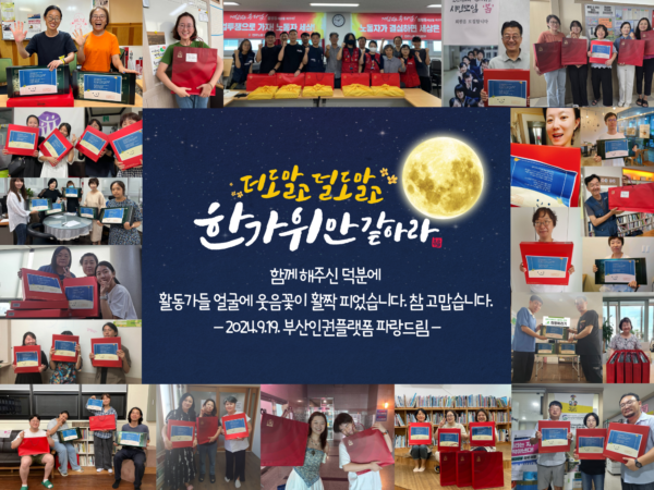 8월 : 강난희, 김기홍, 김상태, 김석준, 김선주, 김소연, 김영수, 김인선, 김형옥, 김호룡, 마지송, 맨발동무도서관, 맹정은, 박예지박진후, 박지현, 백복주, 부산지역공공기관노동조합협의회, 불광나눔회, 서유민, 서은영, 손정옥, 송세경, 심현, 안미란, 양성교회, 양창아, 여울이되는말터, 유선경, 윤성희, 이광수, 이복순, 이수경, 이인경, 이주원(이하람), 이지은, 이현우, 이효진, 임애정, 임채웅, 전재민, 전진성, 정귀순, 정대훈, 정의헌, 조병준, 조형래, (주)태영철재, 천연옥, 최경수, 최창남, 한상규, 홍신철, 효민동우엄마, CS치과병원, ‘익명’, ‘2024추석선물모금’ 9월 : 공공운수노조 부산지역지부, 권현석, 김선비, 김진혁, 김주완, 나윤경, 노수연, 문성원, 민문식, 박상현, 박용찬, 박효엽, 빨간집, 부산대생협지회, 설정희, 송수민, 억불상회, 윤경태, 윤소윤, 윤충열, 이근용, 이미현, 이민영, 이수향, 이주영, 이철수, 임해원, 장영석, 정나겸, 정나위, 정수진, 천덕희, 최정옥, 화물연대 부산본부